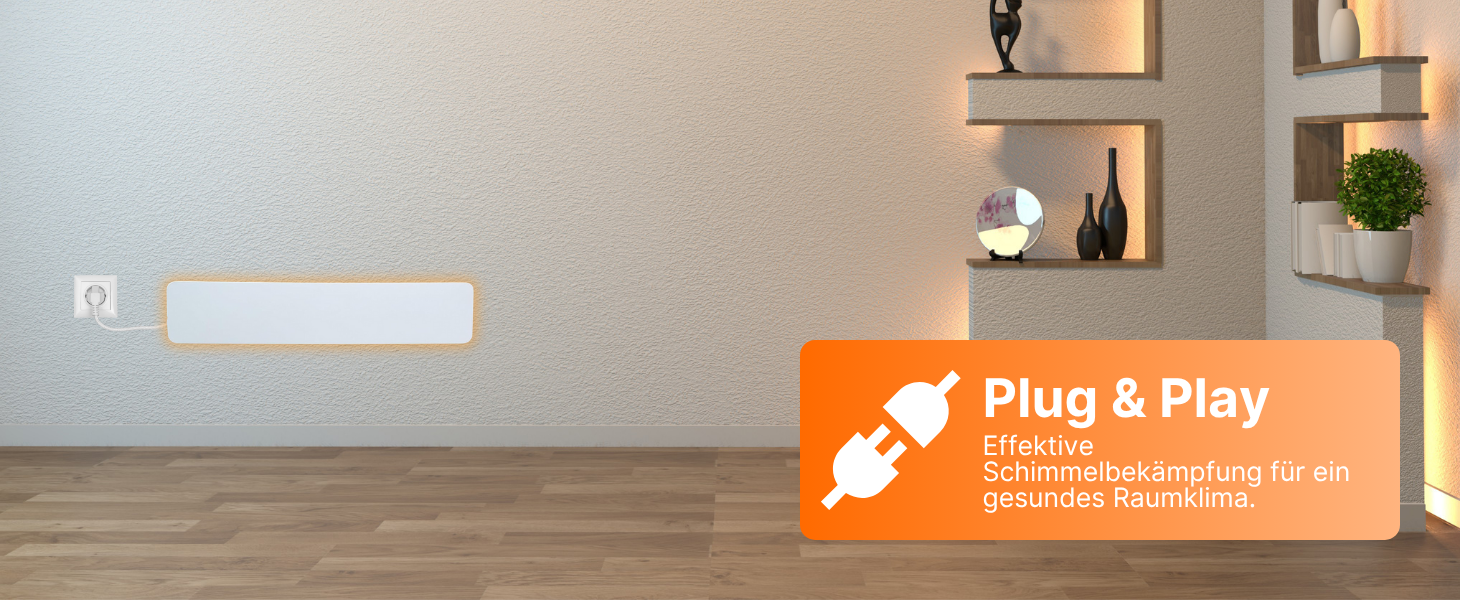 Den Sollero Schimmelentferner einstecken und anfangs dauerhaft laufen lassen. Die Dauer hängt vom Feuchtigkeitsgrad der Wand ab.