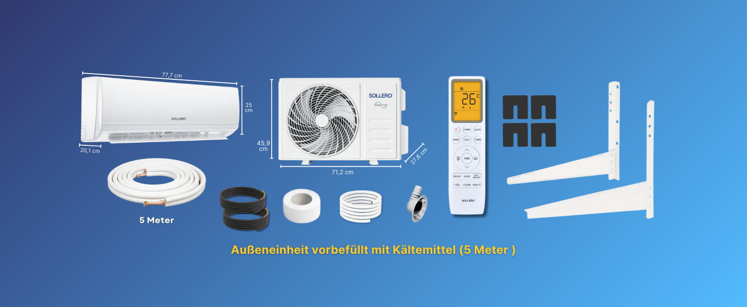 Die Sollero Klimaanlage besteht aus einer leisen Inneneinheit und einer robusten Außeneinheit – ideal für kleine Räume, Wohnungen oder Mietwohnungen. Dank moderner Inverter-Technologie und vorgefülltem R32-Kältemittel sorgt die Klimaanlage für effizientes Heizen und Kühlen bei geringem Stromverbrauch (A++).