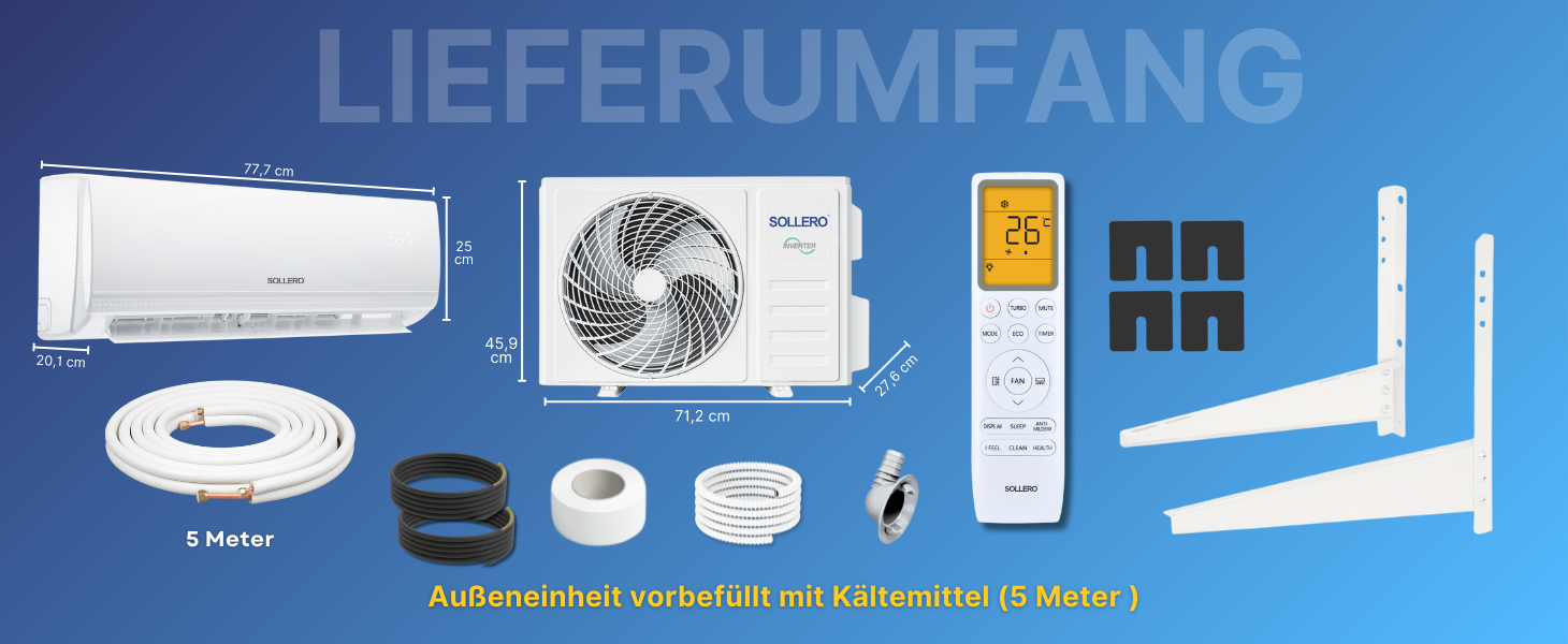Die Sollero Klimaanlage besteht aus einer leisen Inneneinheit und einer robusten Außeneinheit – ideal für kleine Räume, Wohnungen oder Mietwohnungen. Dank moderner Inverter-Technologie und vorgefülltem R32-Kältemittel sorgt die Klimaanlage für effizientes Heizen und Kühlen bei geringem Stromverbrauch (A++).